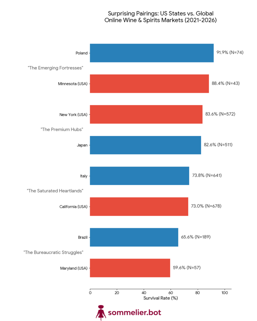 Who knew that Minnesota was one of the safest places on Earth to sell wine and spirits online? With survival rates hovering around 90%, it performs in lockstep with Poland, one of Europe’s most resilient markets.